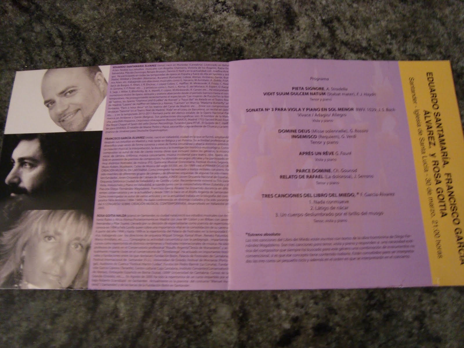El pasado 30 de marzo se estrenó en Santander una obra de Francisco García Álvarez, compuesta sobre tres poemas de mi Libro del miedo. Los intérpretes fueron Eduardo Santamaría (tenor), Francisco García Álvarez (viola) y Rosa Goitia (piano).